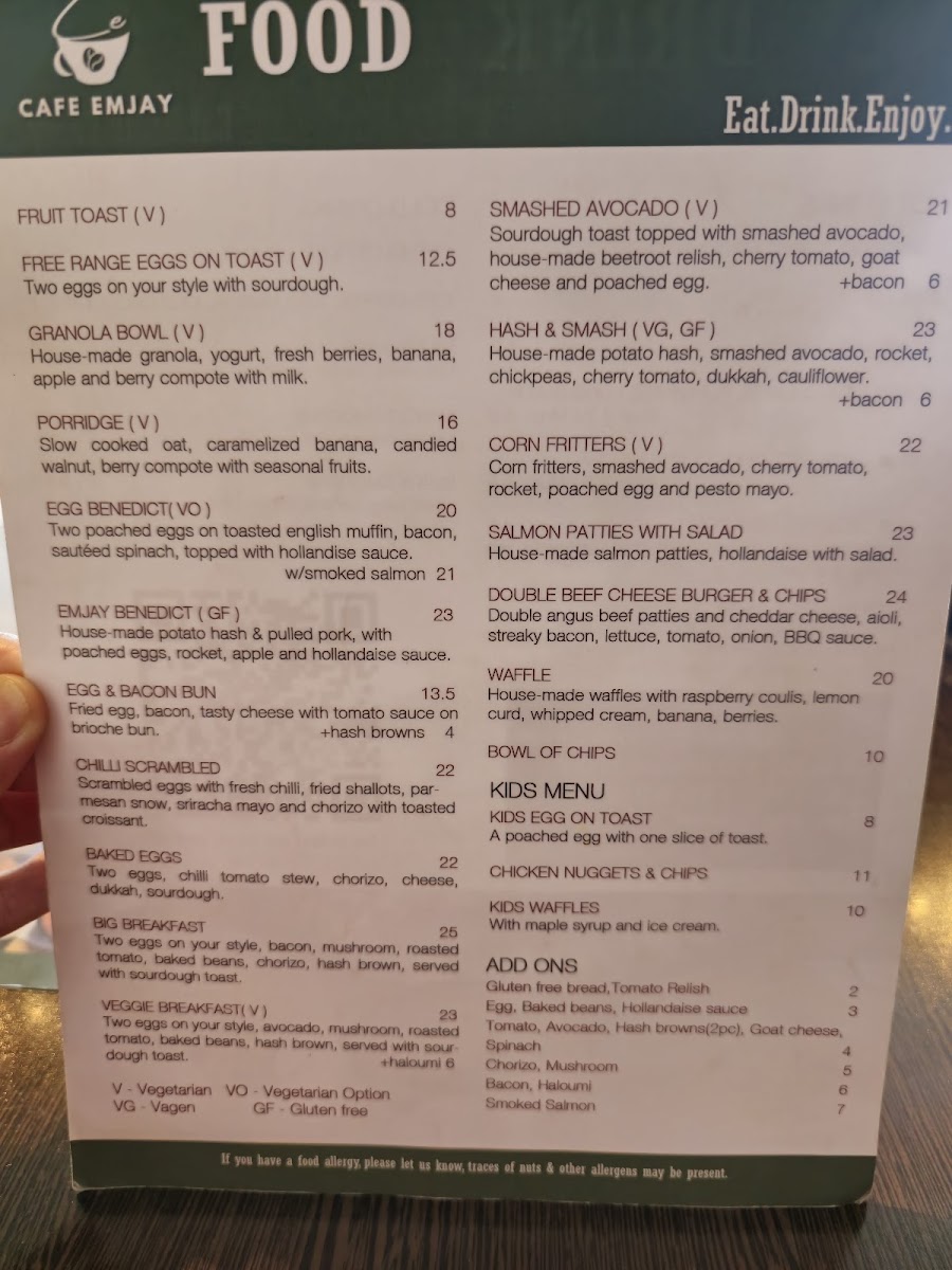 The menu at Cafe Emjay highlights a range of fresh, delicious options, with standout dishes like the Emjay Benedict, praised for its flavor and freshness. Reviewers have lauded the exceptional coffee, perfectly brewed to complement every meal.